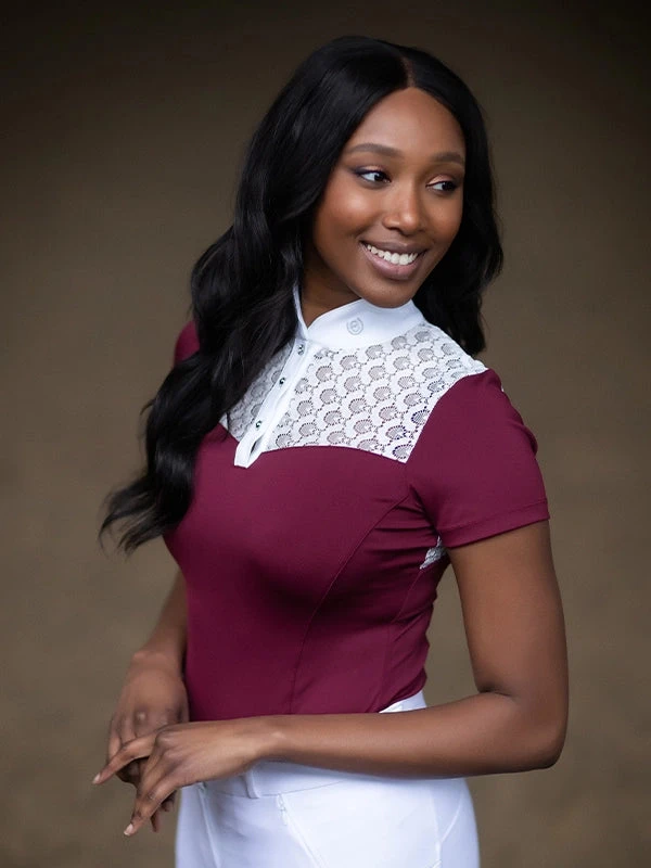 The Champion Top Bordeaux is designed in an elegant Bordeaux colour with gorgeous white lace details at the top and back. Decorated with beautiful crystal buttons on the front and a silver ES logo on the collar, it will make you stand out from the crowd as you compete. Wear it with other items from the Bordeaux collection for a complete look.