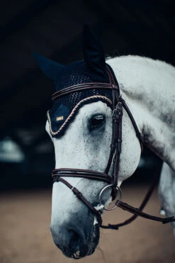 Luxurious ear net in a navy with piping and metal badge in gold. The net helps with both insect protection and noise reduction. Crocheted ear net with elastic cloth by the ears for minimal gall. Matches perfectly with the saddle pad from the same collection.