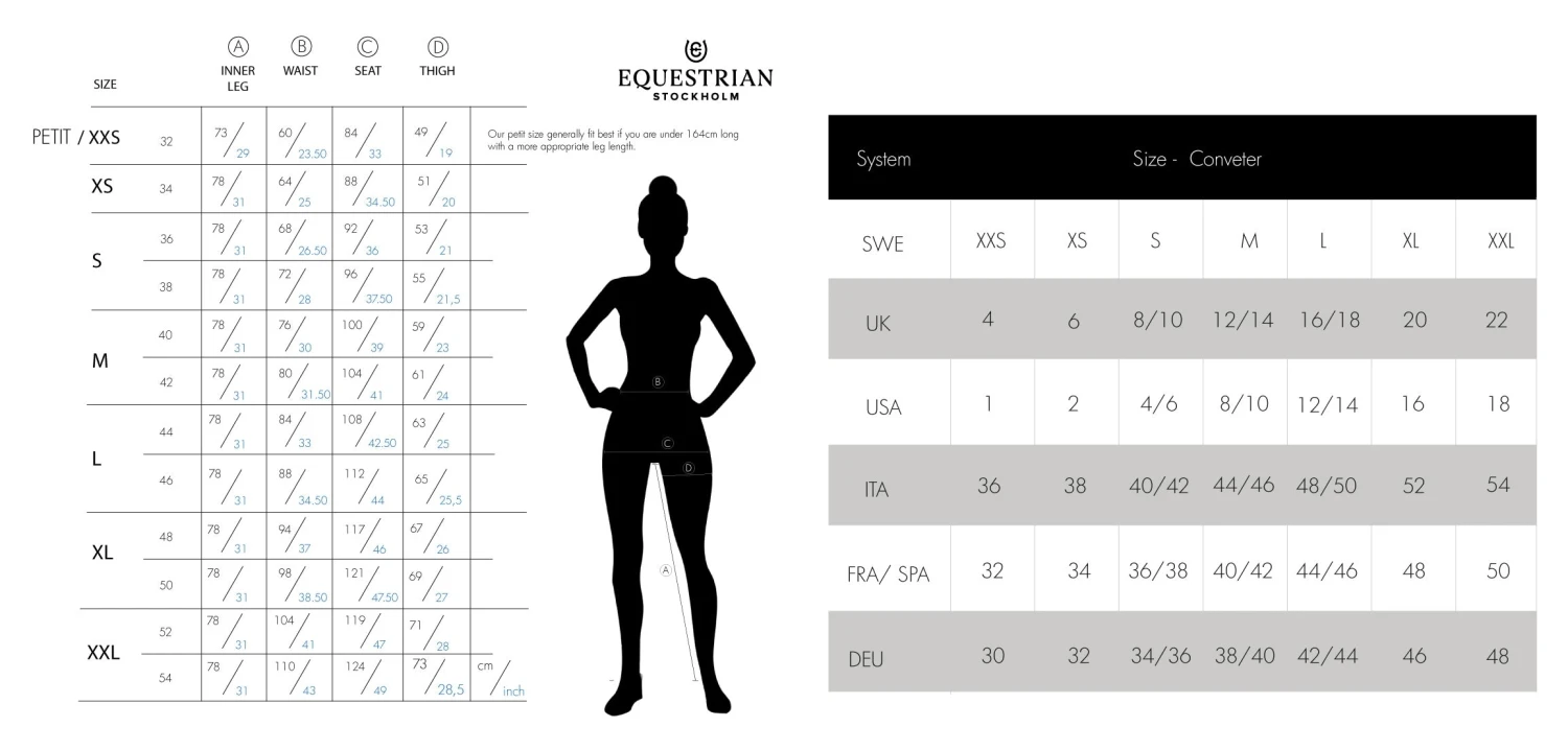 Our stylish riding breeches with full grip come in 4-way stretch material and a wider size range to fit you perfectly. Exclusive riding breeches designed in beautiful cool dark green colour and styled with the Equestrian Stockholm logo. Our riding breeches come with medium high waist and with four good-sized pockets, two with zippers and two pockets for mobile phones on the sides. Full seat silicon grip will help to keep you steady in the saddle. Style it with other products from the Sycamore Green collection for a complete look.