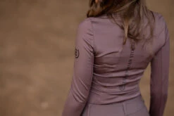 Exclusive and sporty Vision top in a luxurious brown with a touch of purple and with black details. The top is crafted in a breathable, recycled polyester blend with a slim fit. Decorated with a vertical Equestrian Stockholm logo on the back and a smaller logo on the left arm. Wear it with other products from the Amaranth collection for a complete look!