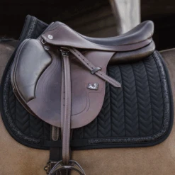 Our Saddle Pad Glitter Stone is shaped for jumping and provides excellent cushioning between the horse’s back and the saddle while protecting against friction. This saddle pad has a unique fishbone quilting and features a stunning Glitter stone binding. It has no annoying straps to attach to the saddle, only a nylon strap for the girth. It is machine washable at 30°, no dryer. We advise you to use a washing bag to avoid the pearls from damaging.