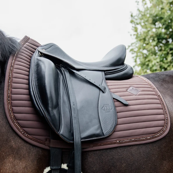 Our Saddle Pad Pearls is shaped for dressage and provides excellent cushioning between the horse’s back and the saddle while protecting against friction. This saddle pad has a unique horizontal quilting and is made out of a breathable material (43% Nylon, 43% Polyester and 14% Spandex). The stunning piping made out of pearls is a real eye-catcher! This saddle pad in combination with one of our Fly Veils Stone & Pearl (Long or Wellington) or Fly Veil Wellington Glitter Band is just drop-dead-gorgeous! The saddle pad has no annoying straps to attach to the saddle, only a nylon strap for the girth. It features a subtle leather logo in the same color as the saddle pad, whilst still offering enough room to embroider it if needed. The saddle pad is machine washable at 30°, no dryer. We advise you to use a washing bag to avoid the pearls from damaging. We advise you to use a washing bag to avoid the pearls from damaging.