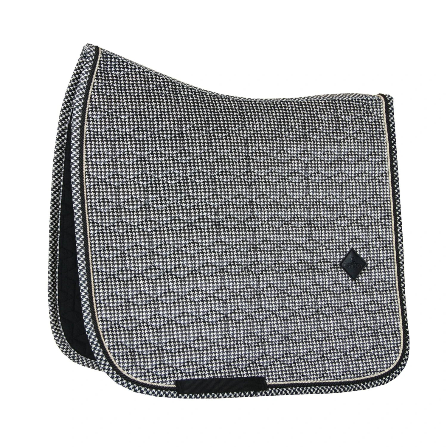 This saddle pad is printed with the Pied-de-Poule pattern, a fashion classic that brings rhythm and elegance, on a microfiber fabric. This saddle pad has a quilted star patten and a double twist piping in similar tones.