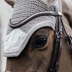 Our Fly Veil velvet is a combination of the modern American look and Kentucky Horsewear’s expertise. This fly veil is hand knitted for better durability, finished with fancy velvet details. The Fly Veil velvet protects the horse’s ears against flies while riding. The material around the ears is stretch and slim fit. The neck part is longer so it can’t slip. The Fly Veil velvet does not have a visible logo, therefore rider or sponsors can embroider their own logo. Hand washing only.